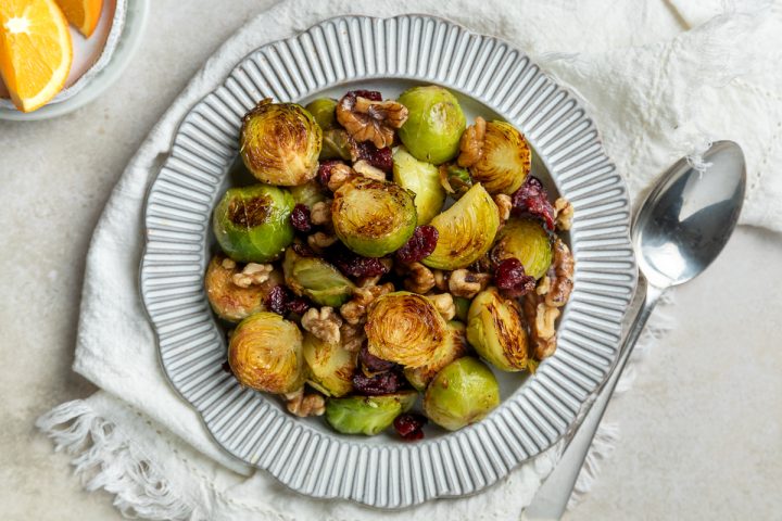 These pan-fried Brussels sprouts with crunchy toasted walnuts, dried cranberries and fresh orange juice are a delicious gluten free and vegan side, ready in 15 minutes.