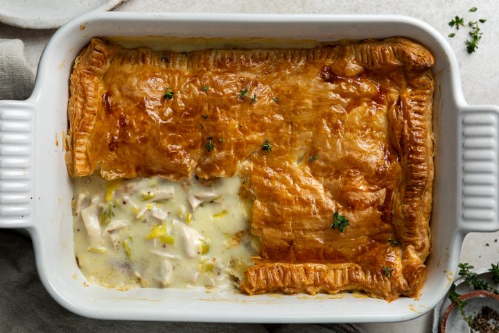 • Using fresh chicken – if you want to make this chicken and leek pie with raw chicken rather than leftover cooked chicken – use 4 chicken thighs, cut into bitesize pieces, season with salt and pepper and fry in a tablespoon of olive oil for 5-10 minutes, until golden (it will still be raw on the inside). Make the sauce, then add the chicken with the mustard, and cook for 10 minutes. Make the pie as per the recipe, cooking until the chicken is cooked through and the puff pastry golden.